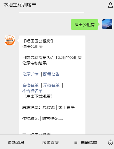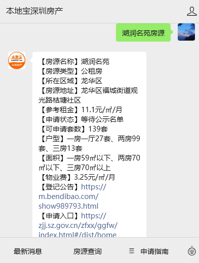 大家扫描下方二维码,跳转【本地宝深圳房产】公众号,回复【房源名称+房源】关键词,也可获取房源信息、申请状态和认租入口等信息,以下图为例: